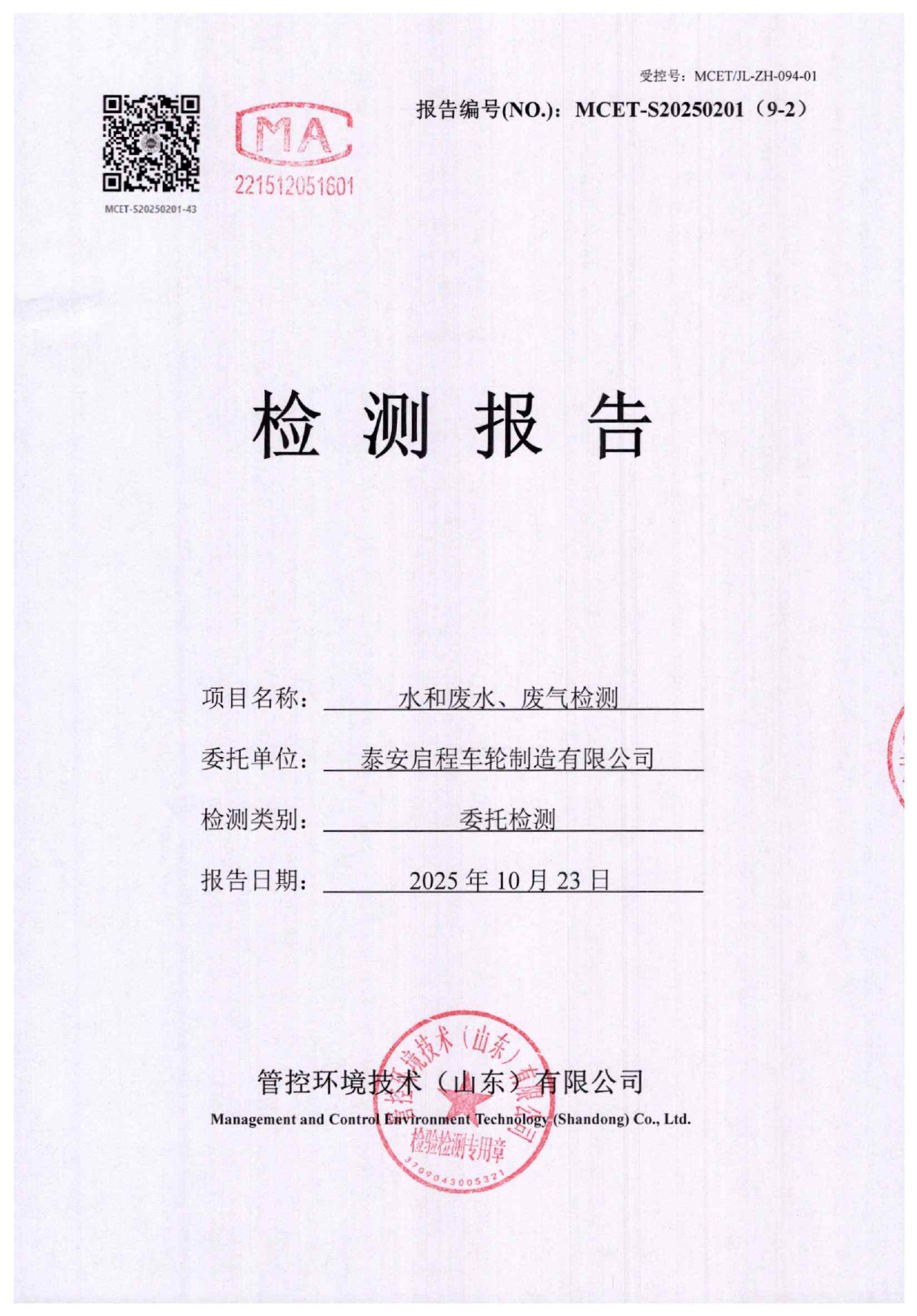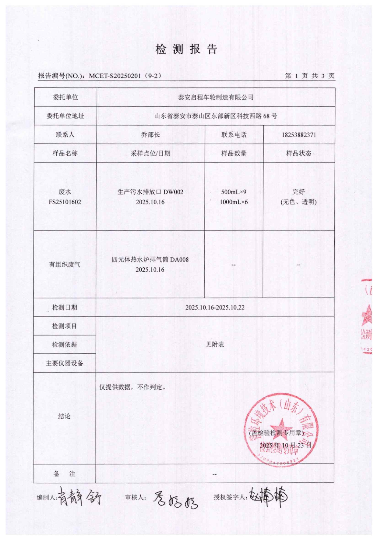 泰安啟程車輪制造有限公司2025年10月份環(huán)境污染物排放檢測報告