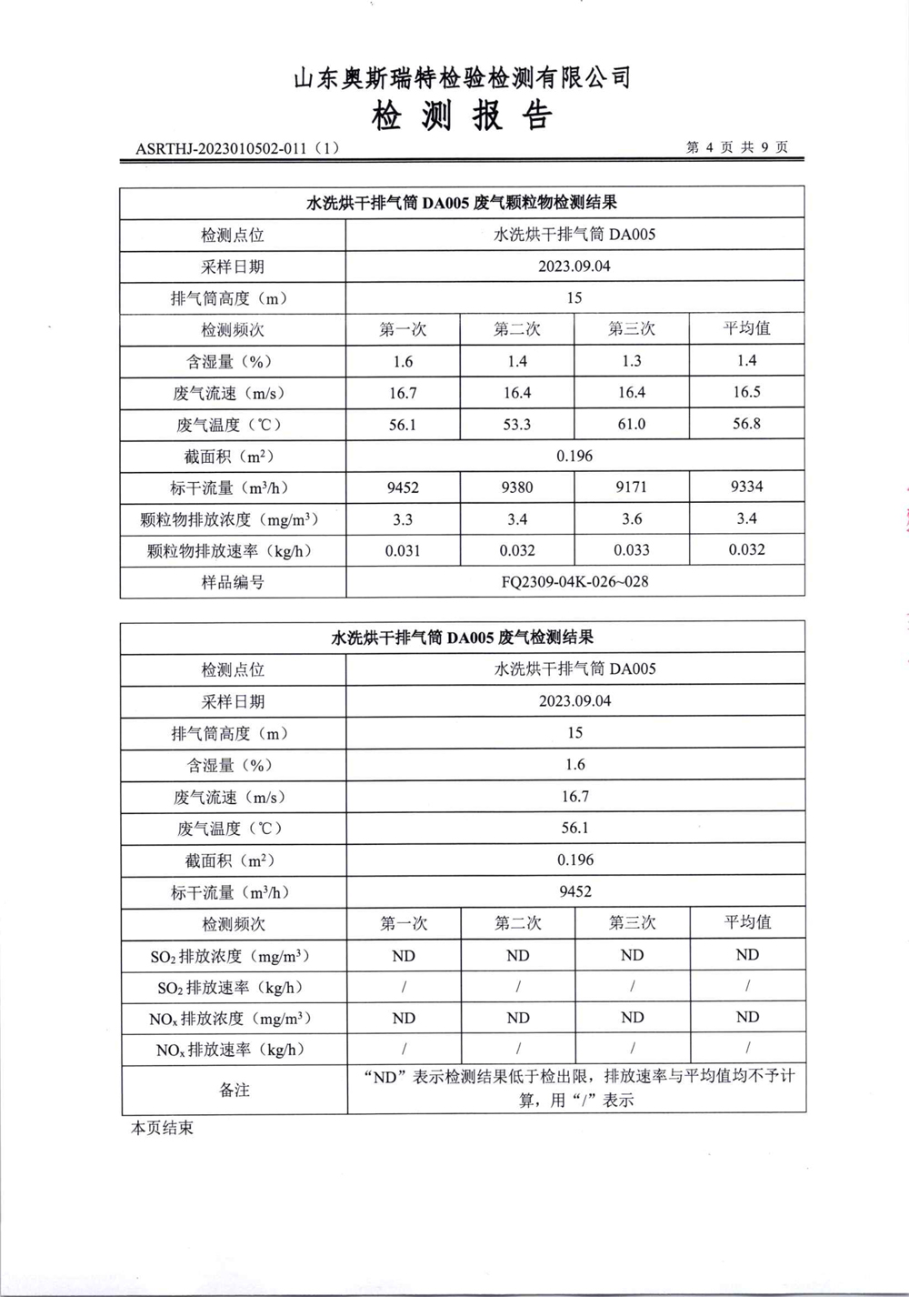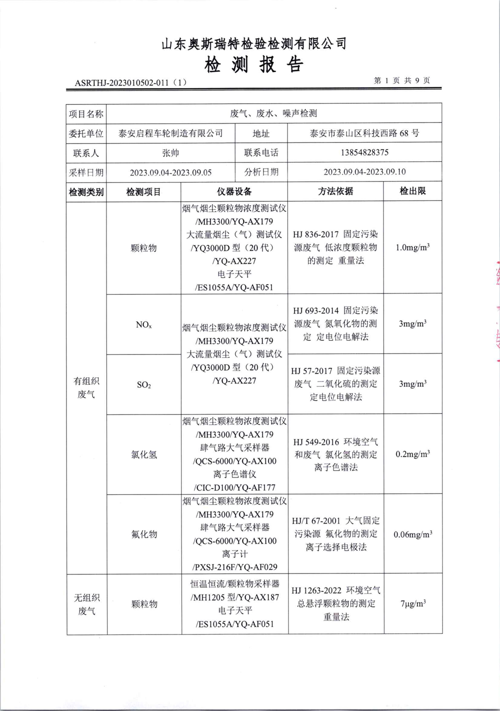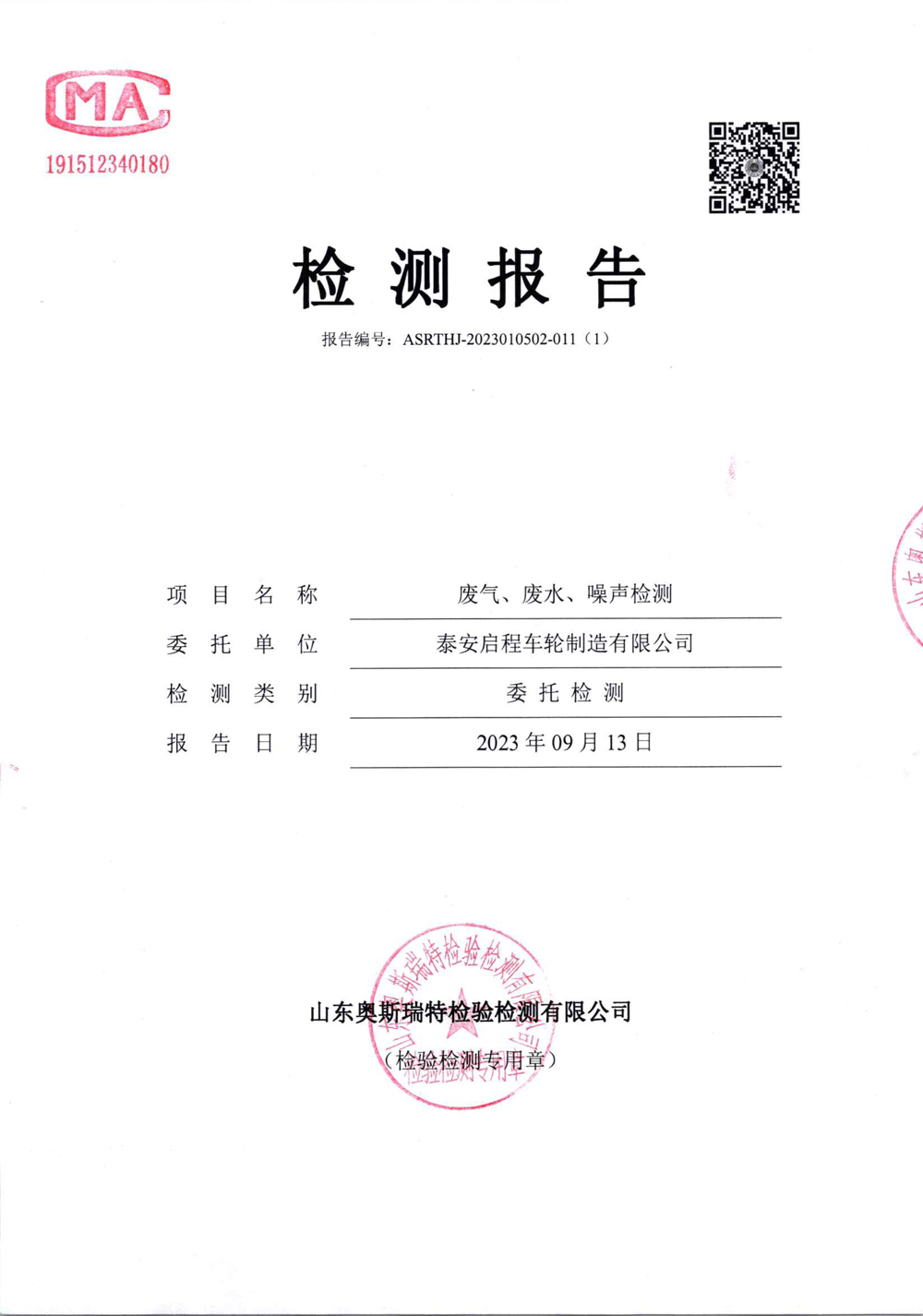 泰安啟程車輪制造有限公司2023年9月份環(huán)境污染物排放檢測報告