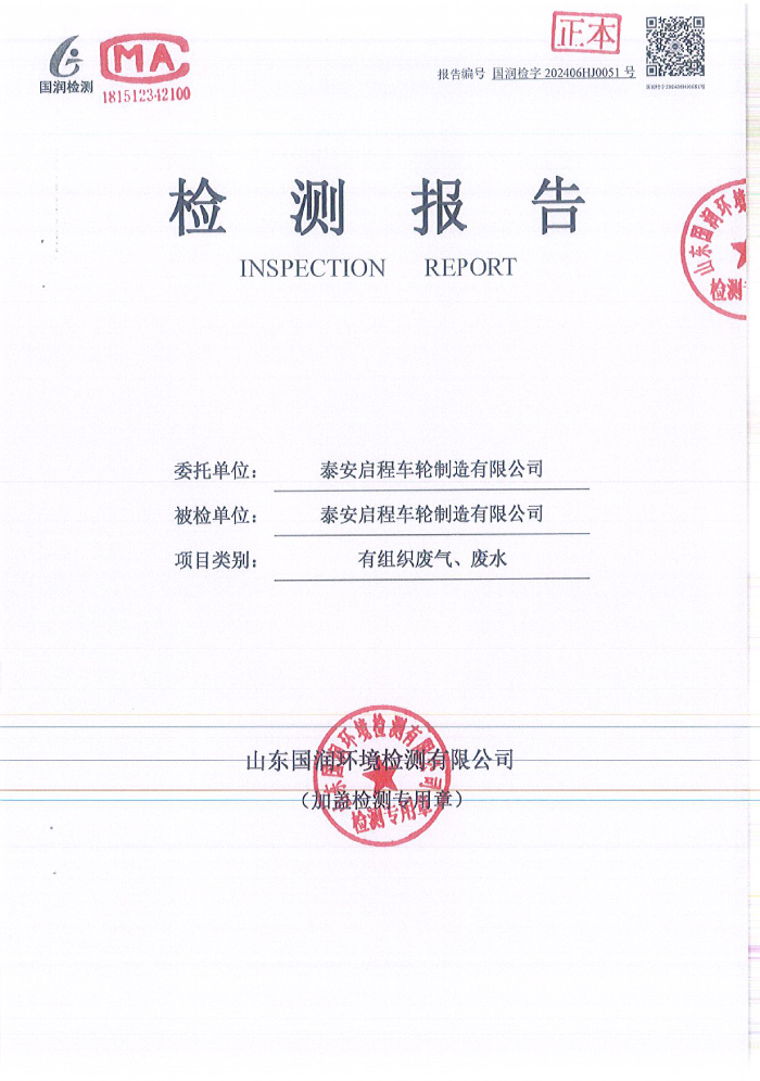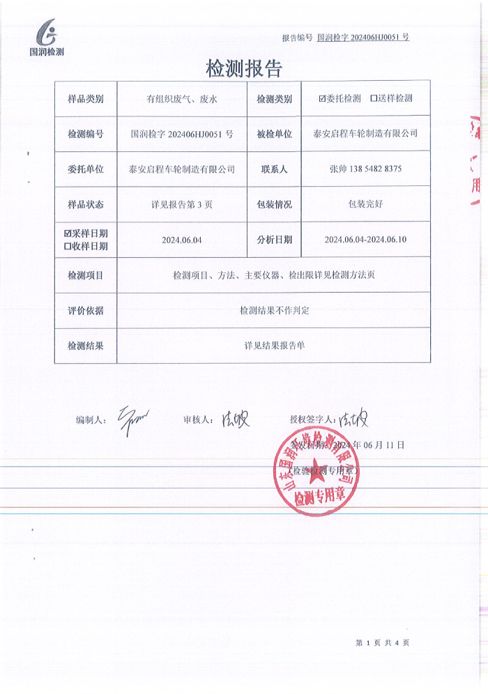 泰安啟程車輪制造有限公司2024年6月份環(huán)境污染物排放檢測報告