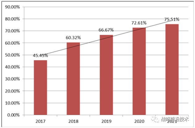 通過(guò)開(kāi)源信息獲取方法我們發(fā)現(xiàn),自2017年1月美國(guó)特朗普政府執(zhí)政,到2021年5月拜登政府通過(guò)《無(wú)盡前沿法案》,美國(guó)會(huì)、政府及重要智庫(kù)共發(fā)布了450份對(duì)華政策文件和研究報(bào)告。這些文件與報(bào)告的主題呈現(xiàn)出兩種趨勢(shì):其一,除綜合性文件與報(bào)告107份之外,聚焦中國(guó)科技發(fā)展及中美科技競(jìng)爭(zhēng)主題的共209份(含科技與經(jīng)濟(jì)交叉、軍事與科技交叉)。相比較而言,以中國(guó)經(jīng)濟(jì)發(fā)展及中美經(jīng)濟(jì)關(guān)系為主題的共82份(含經(jīng)濟(jì)與科技交叉),以中國(guó)軍事及中美軍事關(guān)系為主題的共99份(含軍事與科技交叉、軍事與政治交叉),以中國(guó)政治為主題的為49份(含軍事與政治交叉)。其二,2017年至2021年,以中國(guó)科技發(fā)展及中美科技關(guān)系為主題的文件及報(bào)告占比呈現(xiàn)穩(wěn)步上升趨勢(shì)。近幾年來(lái),均占年度全部文件及報(bào)告總量一半以上(圖1)。