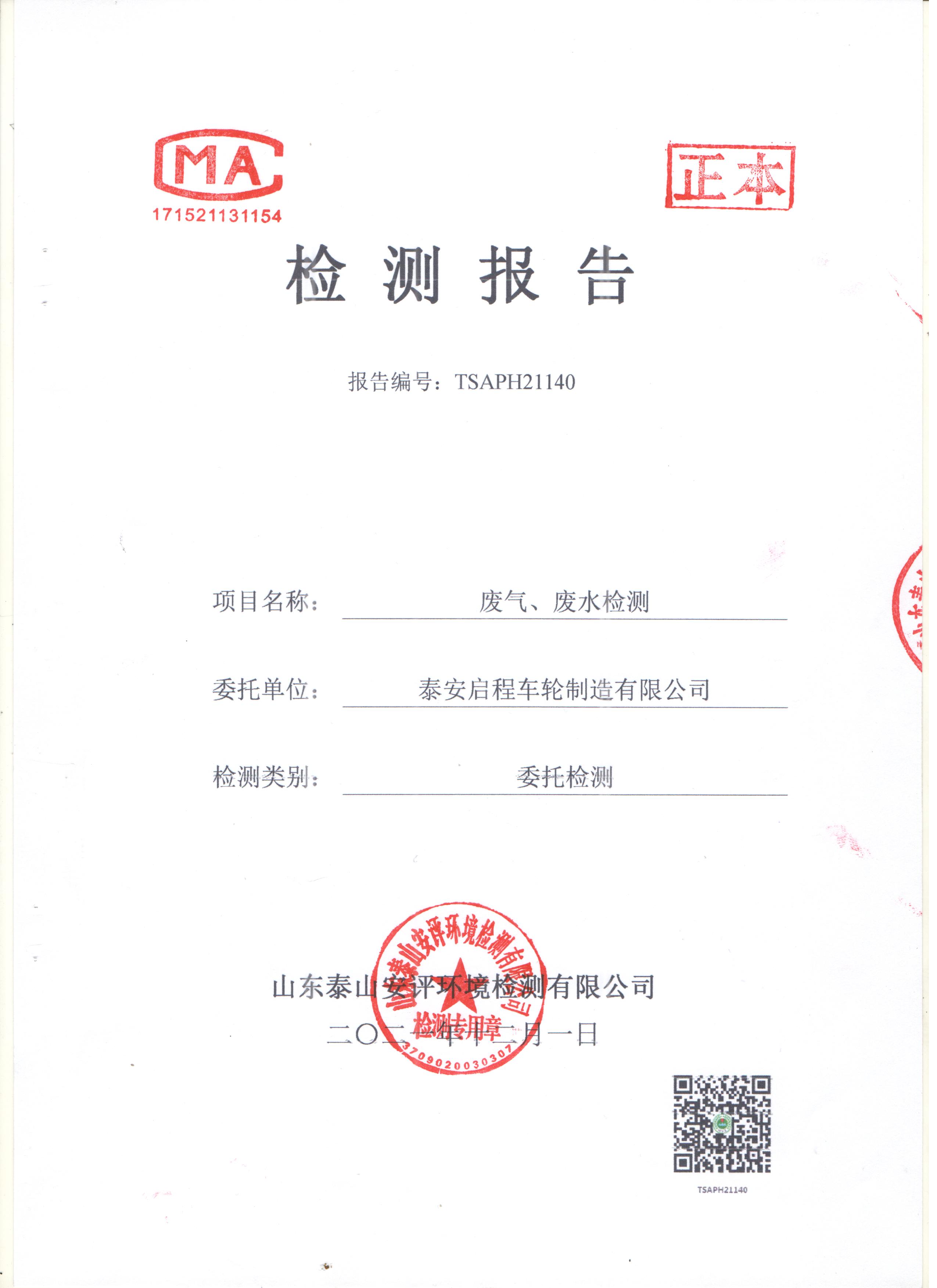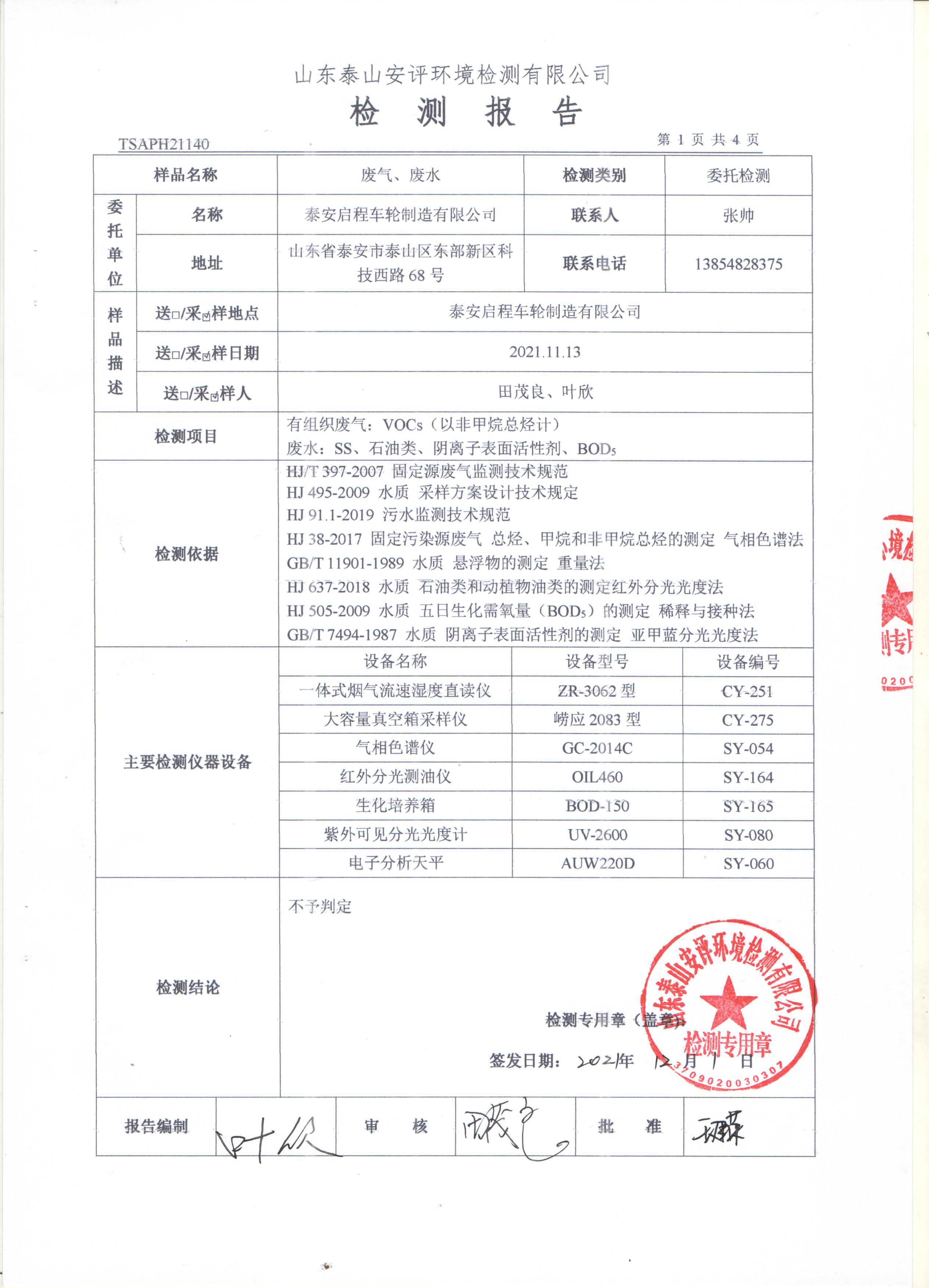 泰安啟程車輪制造有限公司2021年11月份環(huán)境污染物排放檢測(cè)報(bào)告
