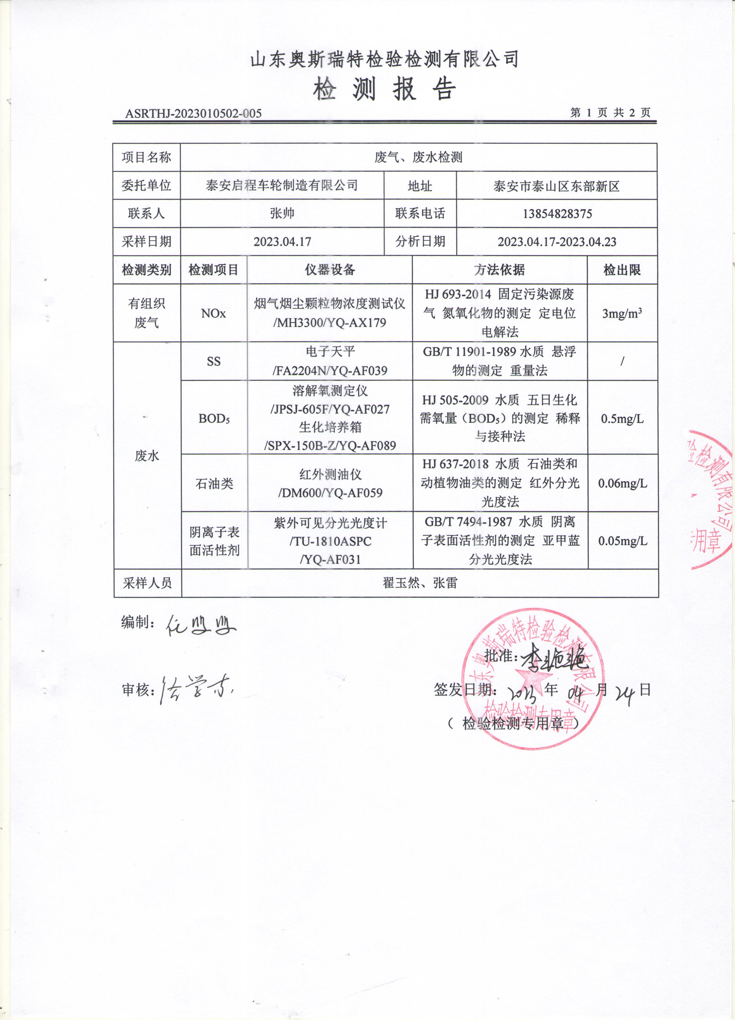 泰安啟程車輪制造有限公司2023年4月份環(huán)境污染物排放檢測(cè)報(bào)告