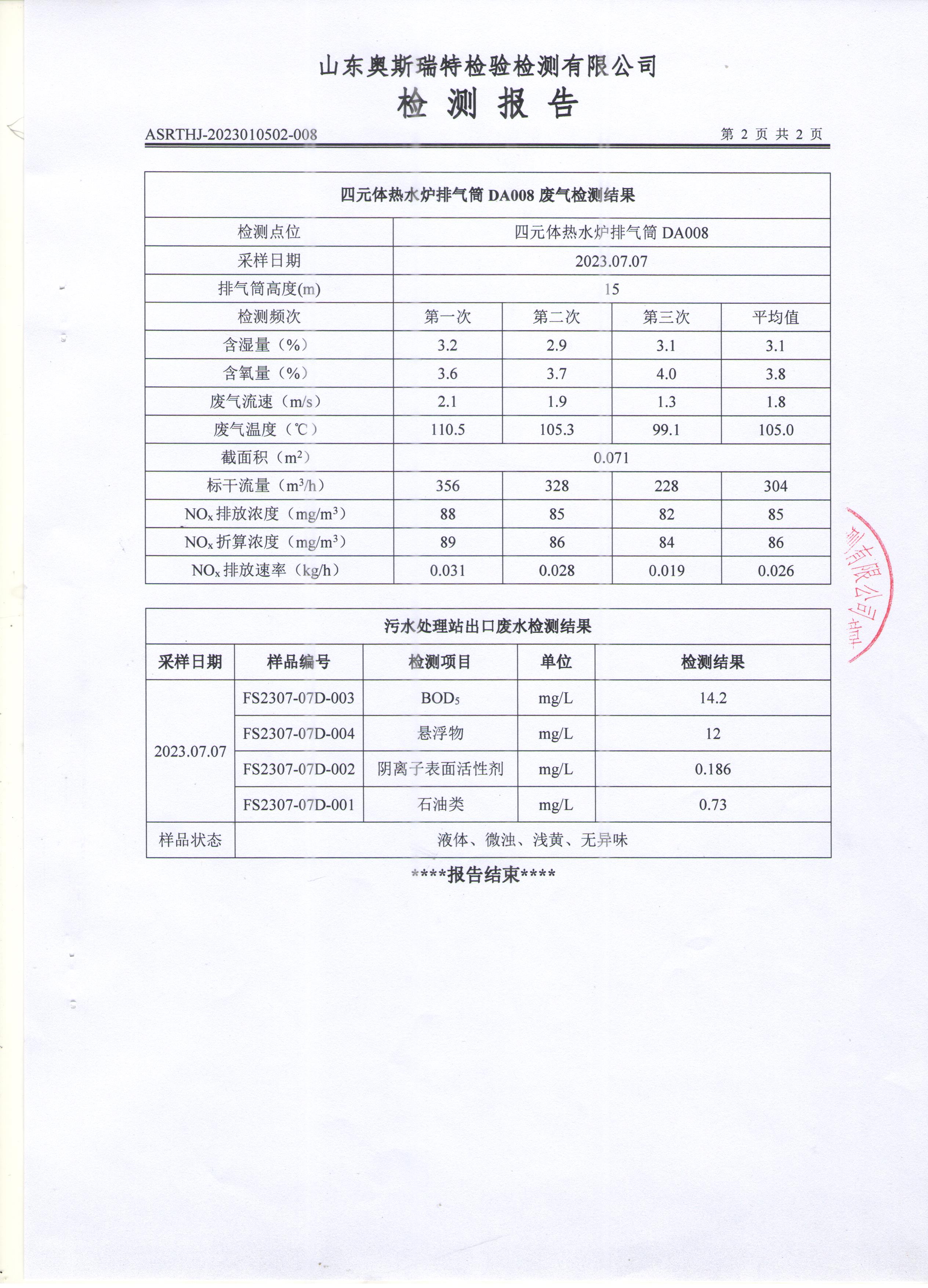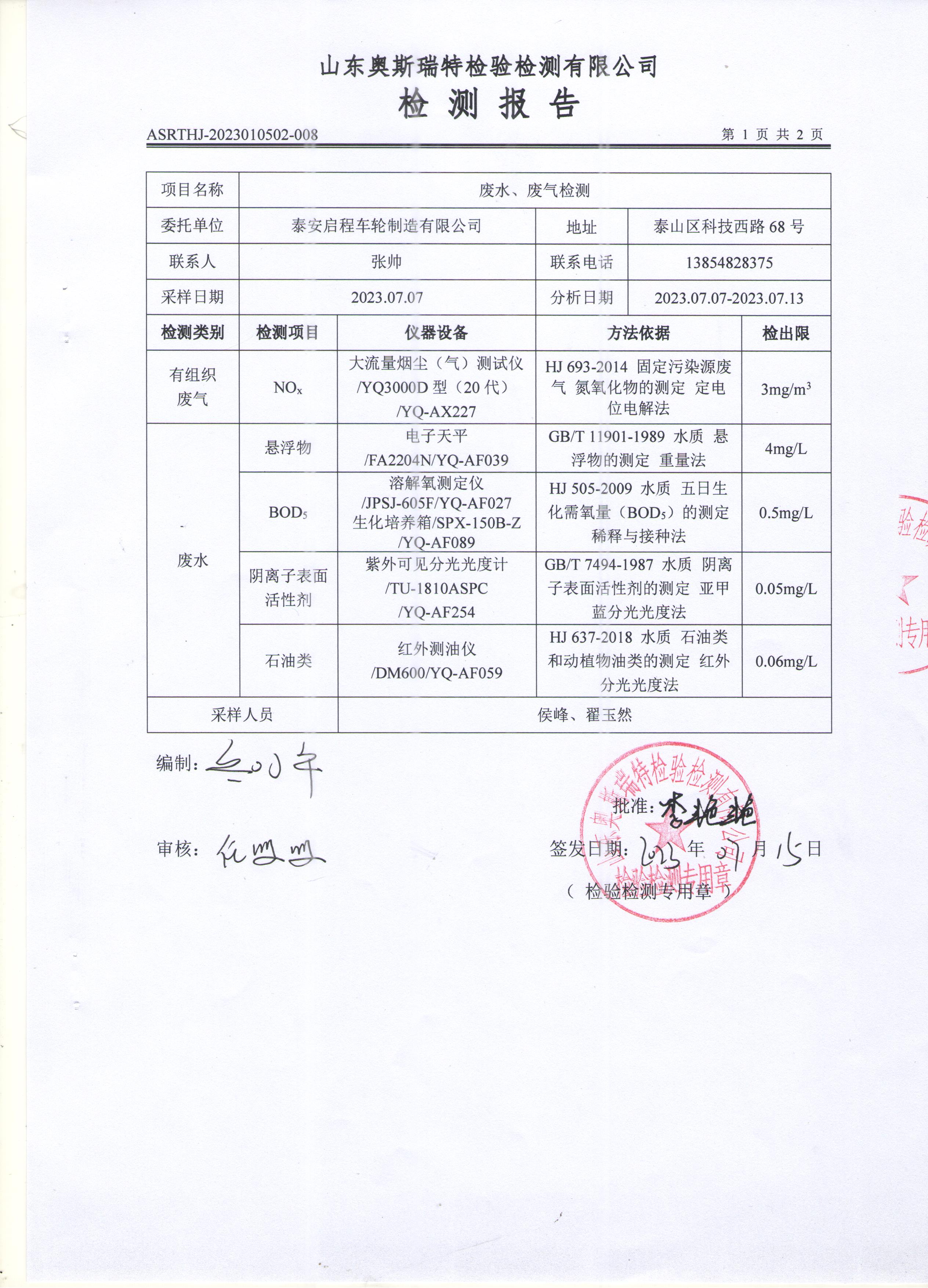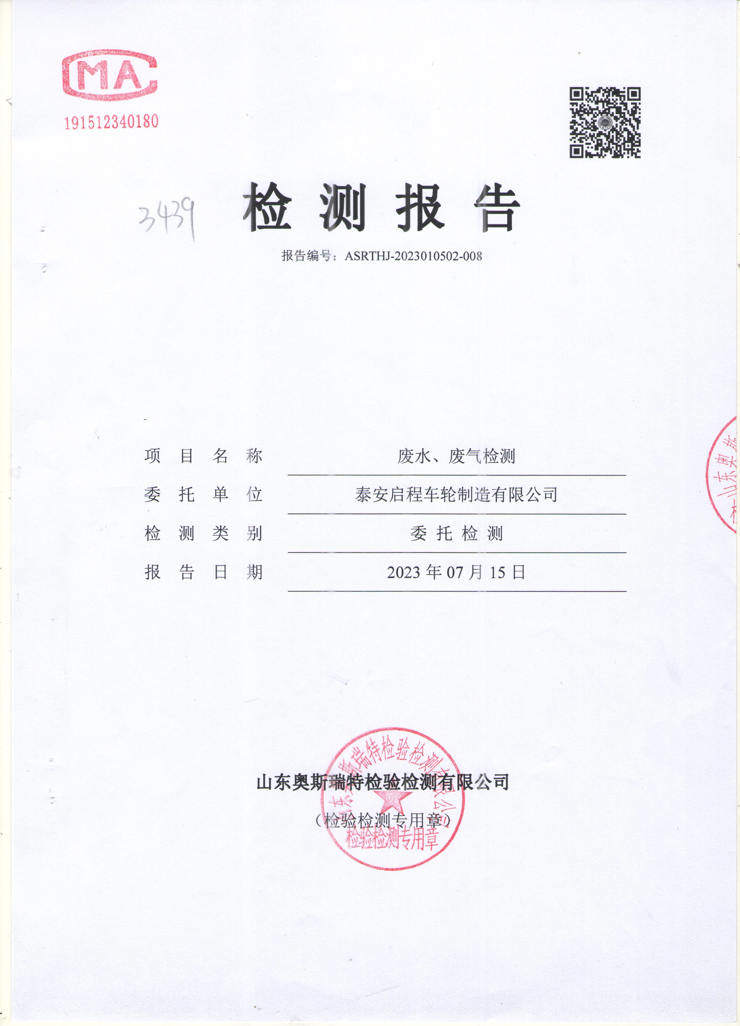泰安啟程車輪制造有限公司2023年7月份環(huán)境污染物排放檢測報告