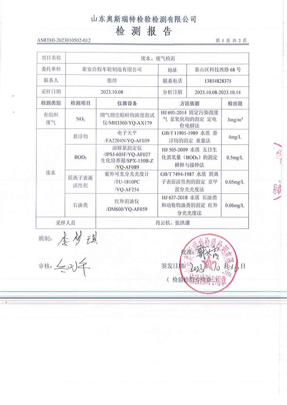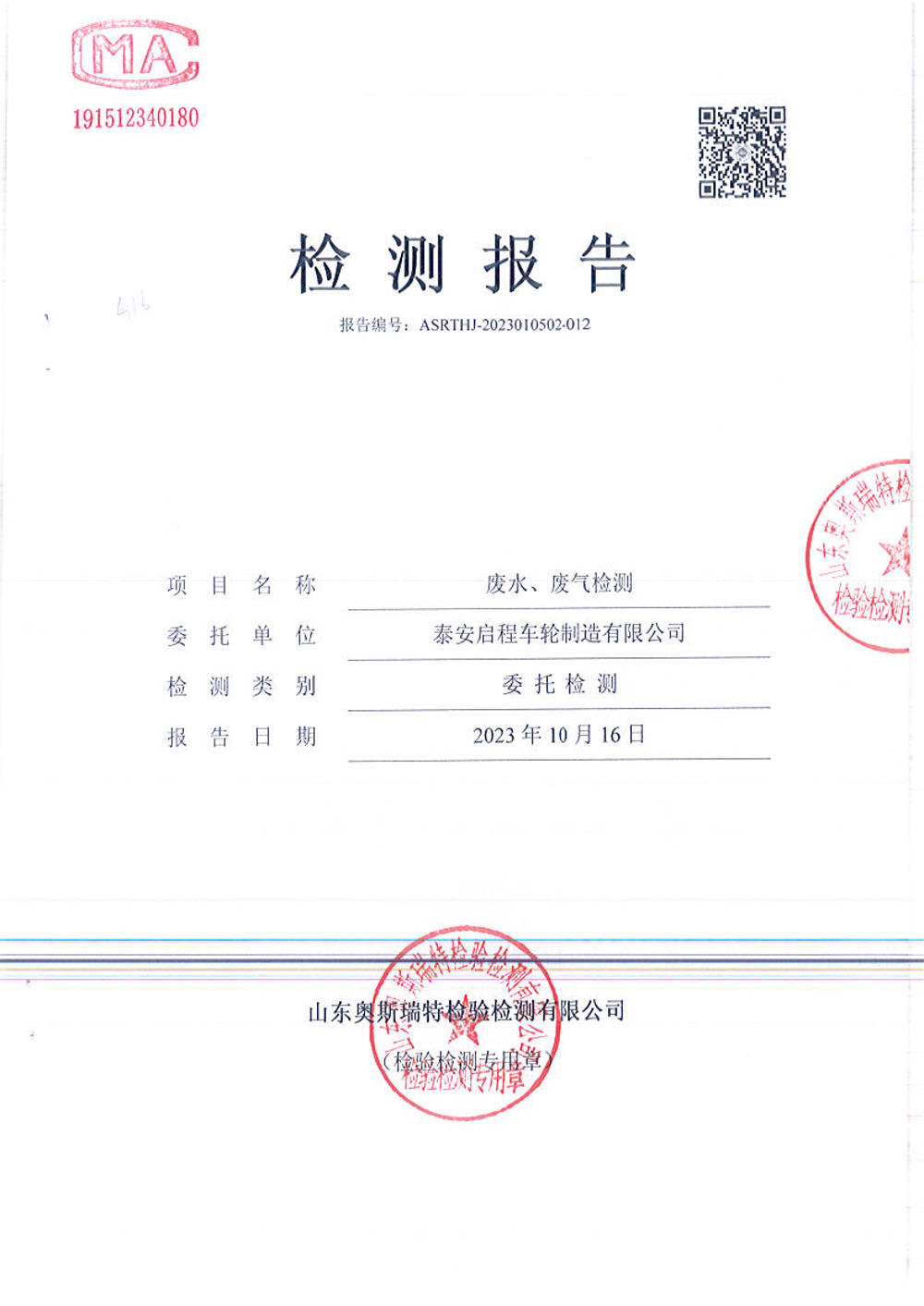 泰安啟程車輪制造有限公司2023年10月份環(huán)境污染物排放檢測(cè)報(bào)告