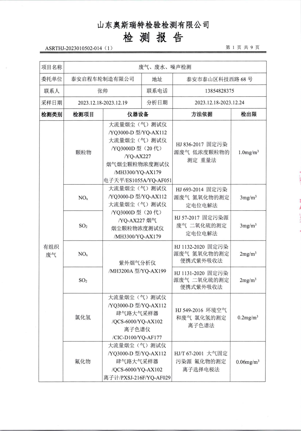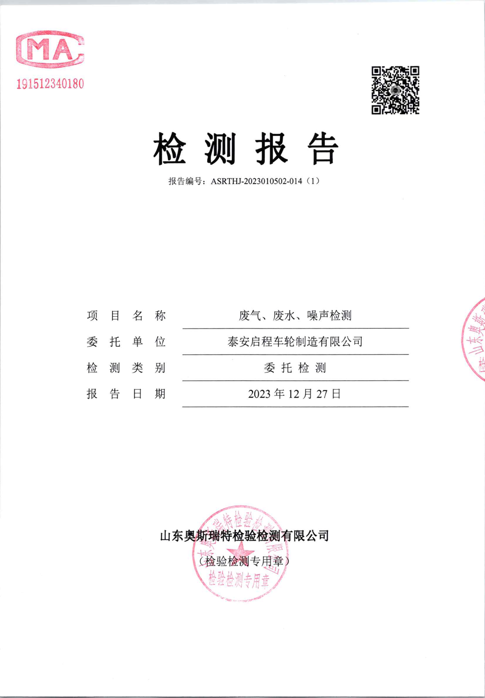 泰安啟程車輪制造有限公司2023年12月份環(huán)境污染物排放檢測(cè)報(bào)告